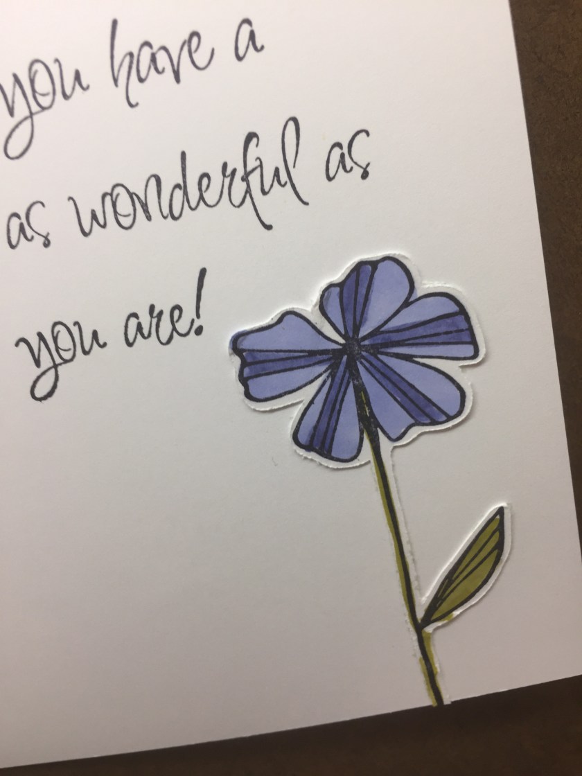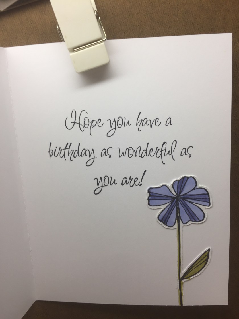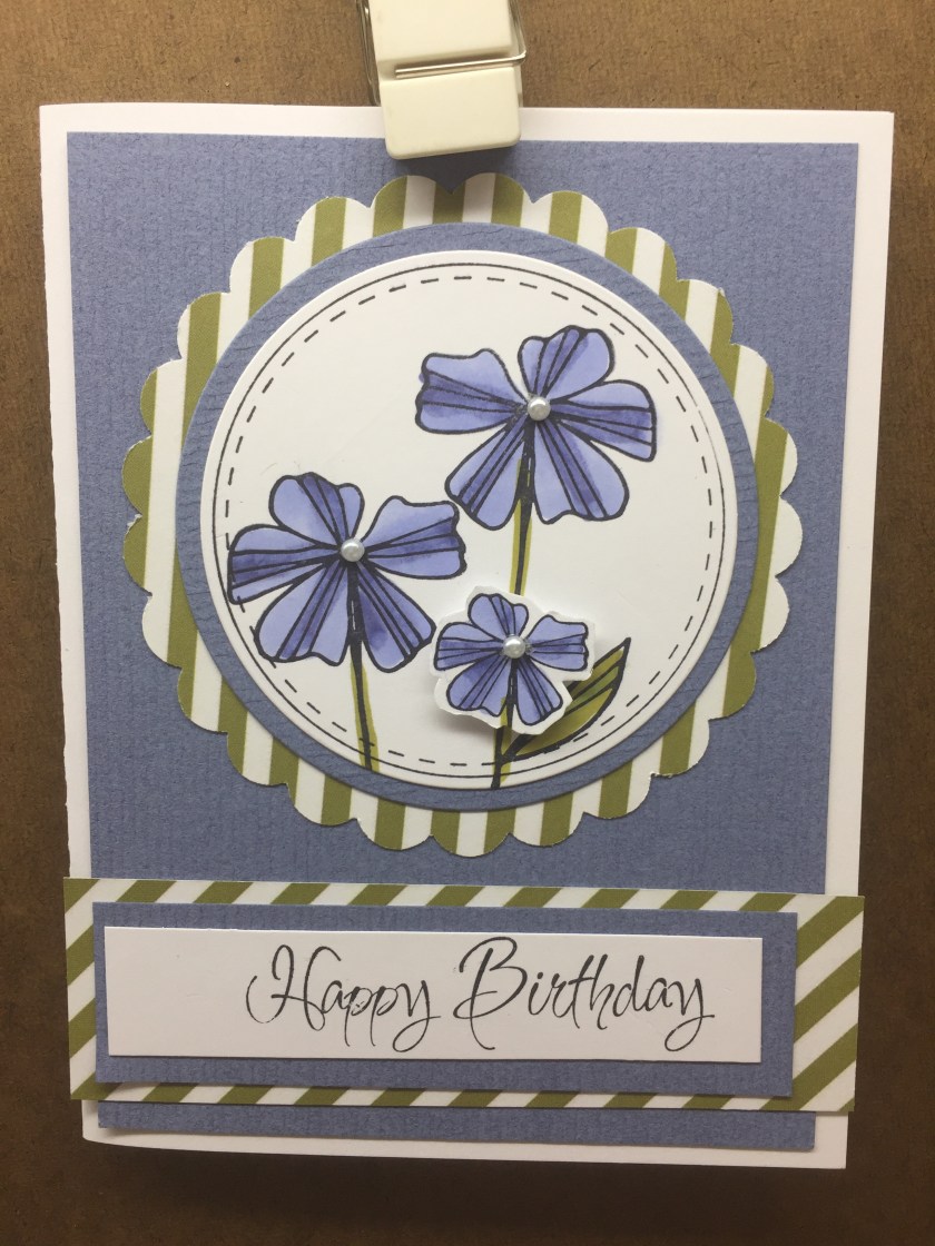 A simple birthday card today. I’m getting bored with our current birthday stamps so we spend a great deal of time designing new ones. Now I can’t hardly wait to get them. 😜