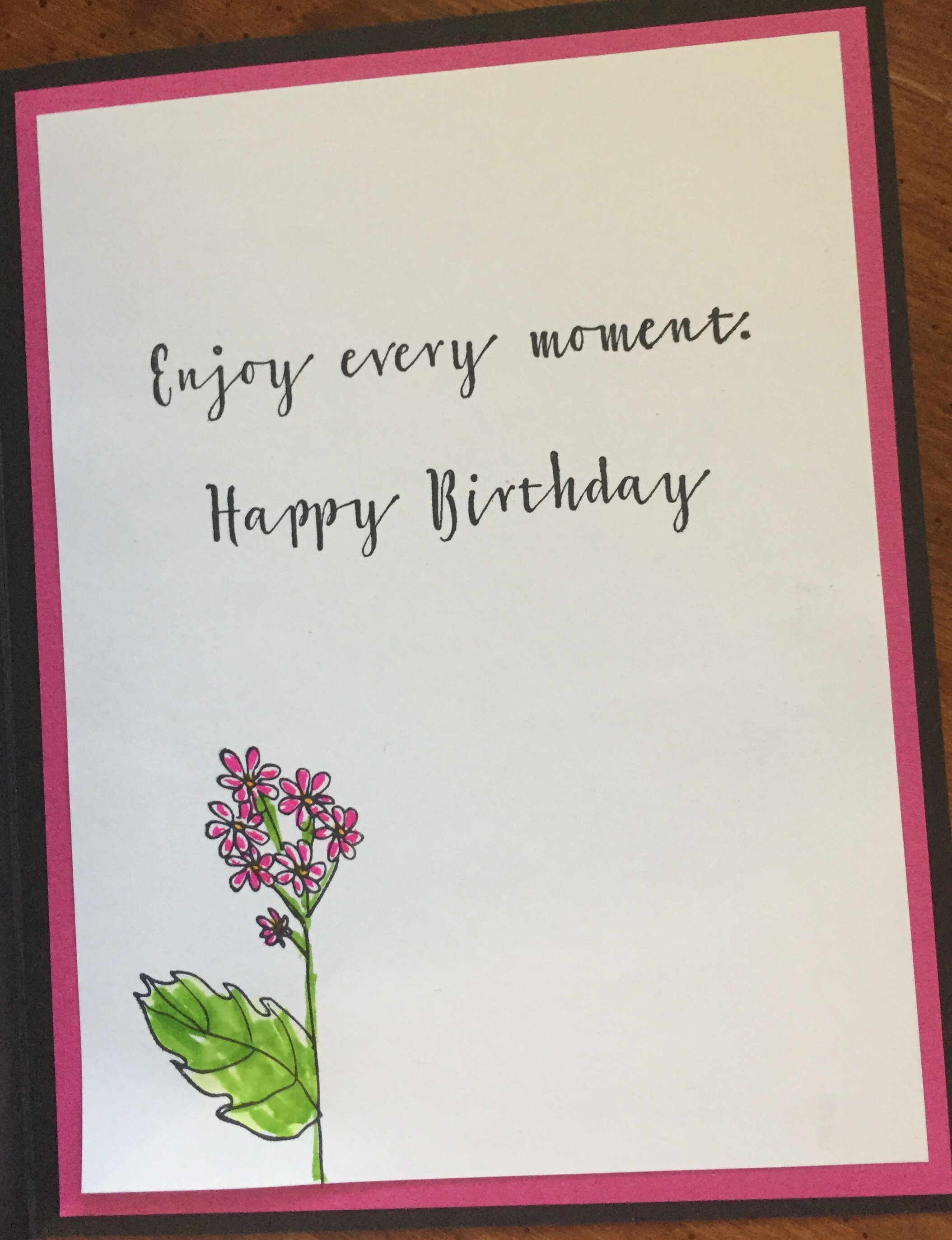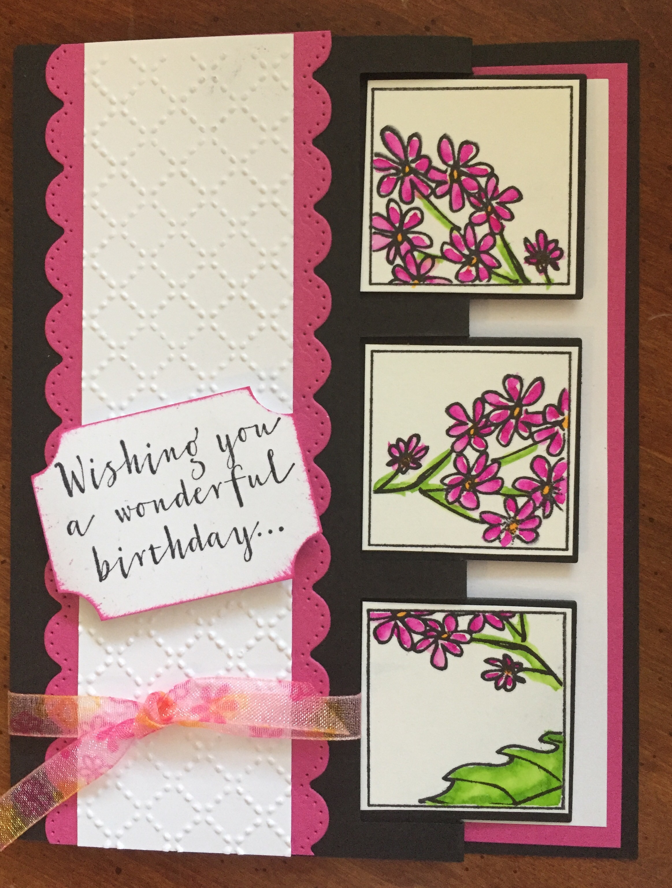 Stamps Used: E296 Wonderful Birthday; D324 Happy Birthday; D325 Enjoy Moment; EE69 KB’s Lilac Med; HH33 KB’s Lilac Lg; D230 Rev Mask Square Med;