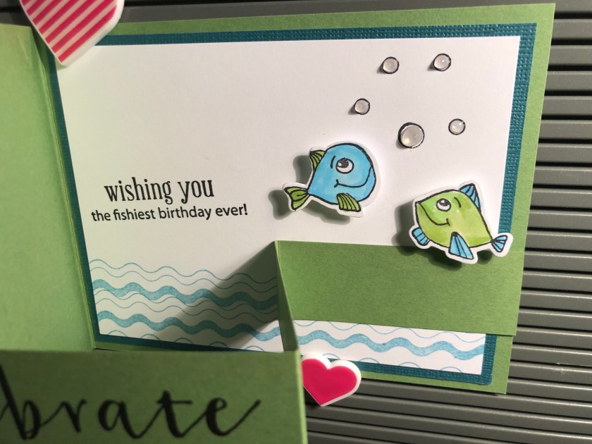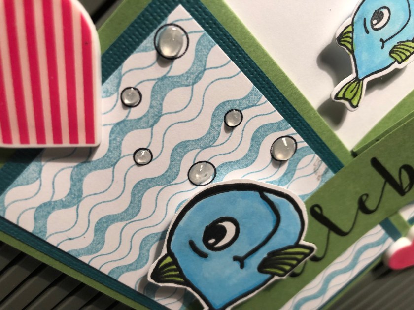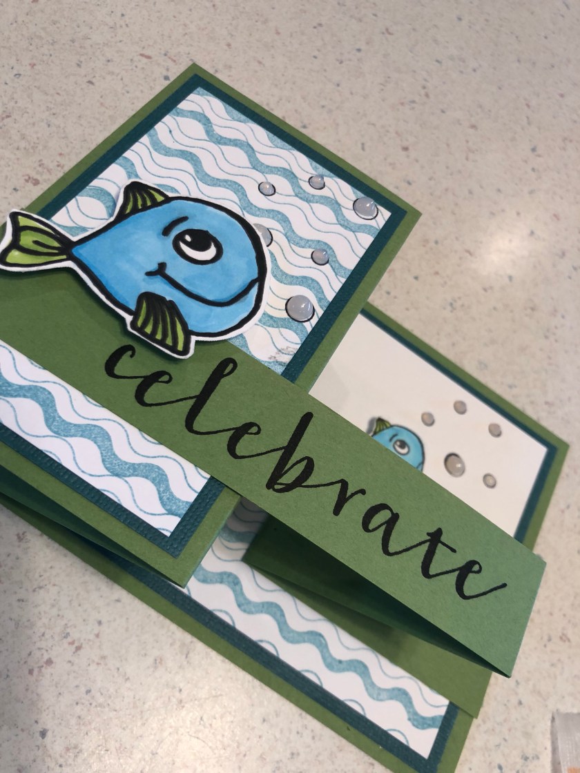 Stamps Used: DD102 Adam Fish Sm; DD103 Ben Fish Sm; AA33 Open Dual Dot; AA34 Open Dual Dot Mini; G346 Celebrate; EE75 Adam Fish Lg; D257 Fishies Birthday; JJ18 Wavy Border;