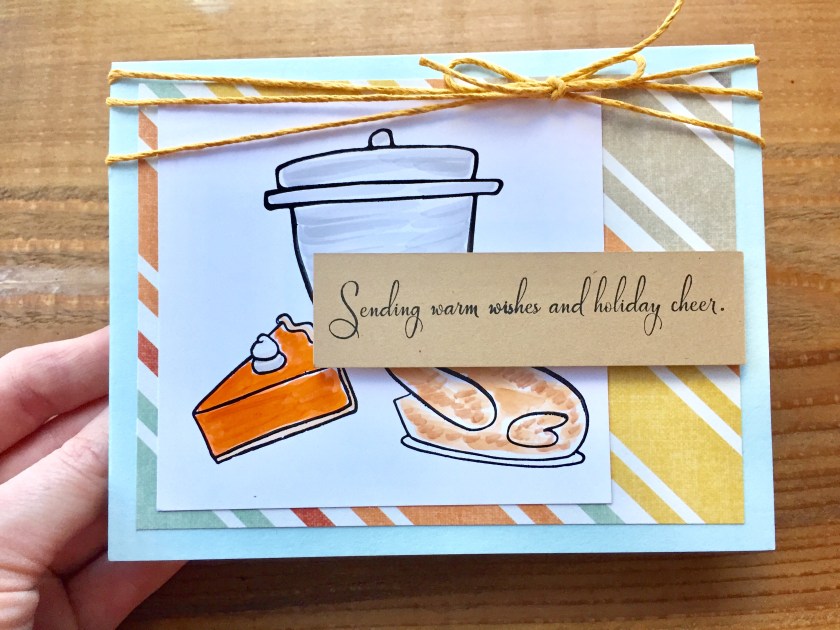 Stamps Used: E308 Cooking Pot; EE60 Pumpkin Pie Slice; EE61 Cooked Turkey; E288 Warm Wishes Holiday Cheer;