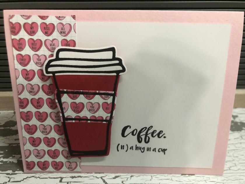 I cut this valentines paper wrong for a card so I needed to find something to do with the paper that was cut wrong…hence a cute coffee card!
