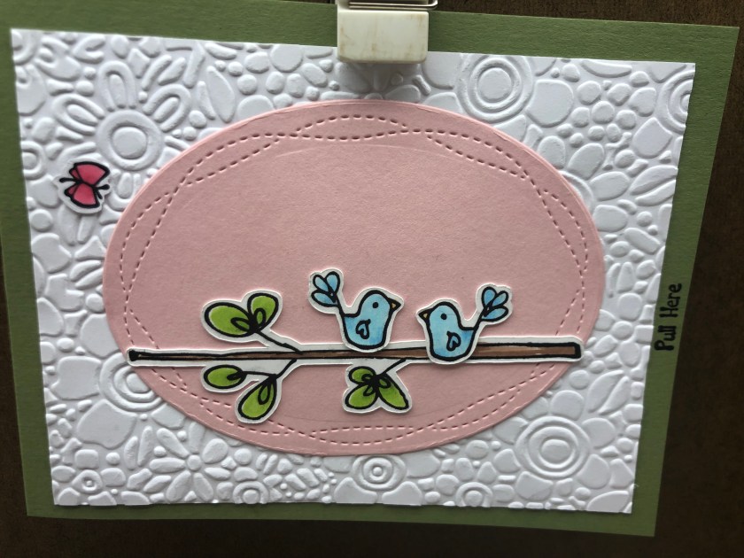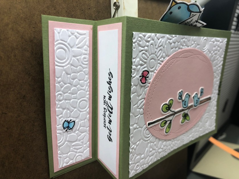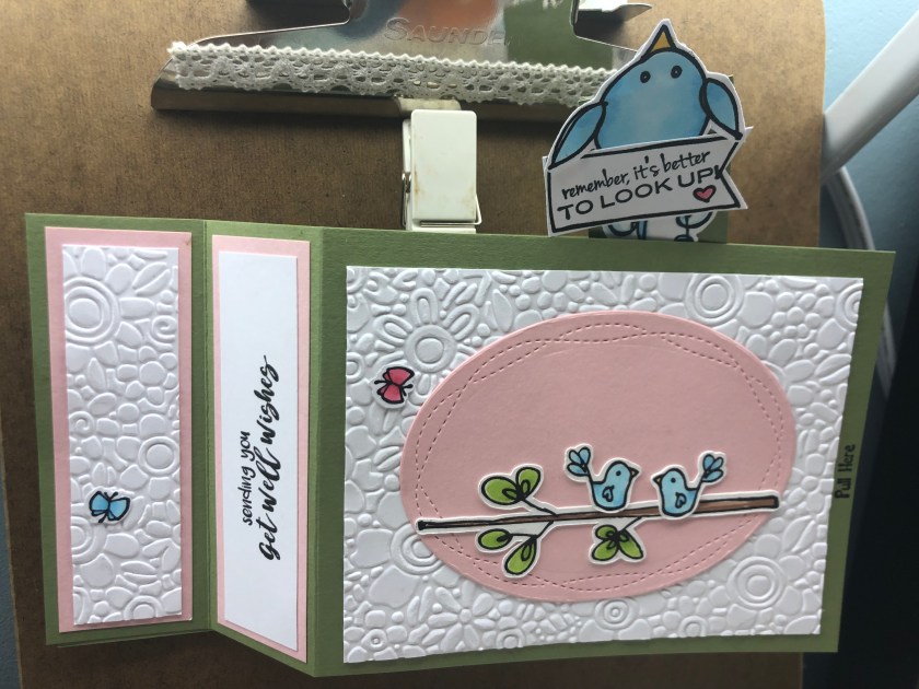 Stamps Used: A232 Pull Here Mini; CC40 KB’s Birds; CMO098 Pull Here Gift Set; D339 Sending Get Well Wishes; AA31 KB’s Mini Fat Butterflies; EE57 Heart Tag Sm; C266 Better Look Up; F230 Emily Bird Lg; G311 KB’s Branch;