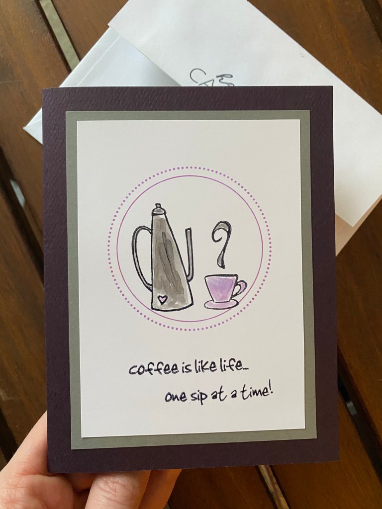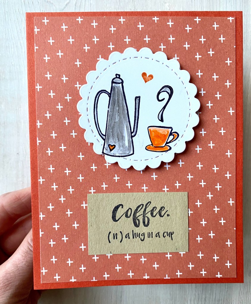 The clear mini coffee pot used in this card is on sale for the next week! Purchase one stamp at regular price (any stamp) and get the mini coffee set 50% off. Just enter HUG in the coupon code!