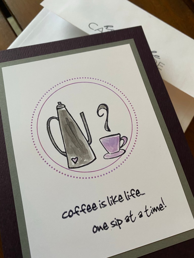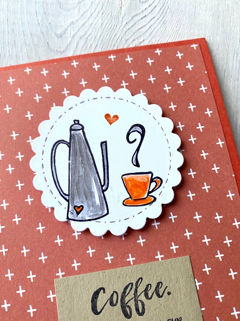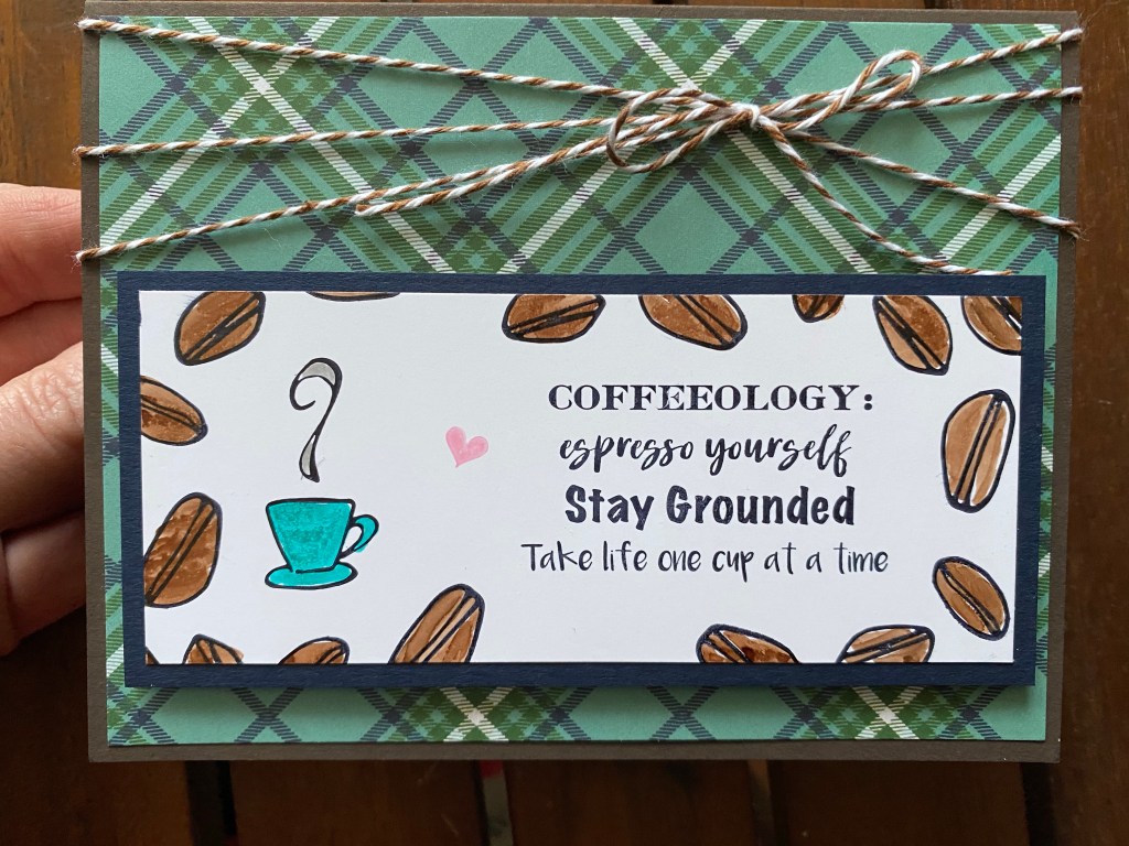 Stamps: E293 Coffee Beans; A190 Tiny Heart; Coffeeology; CC78 Mini Coffee Cups; Mini Coffee Pot Clear Set;