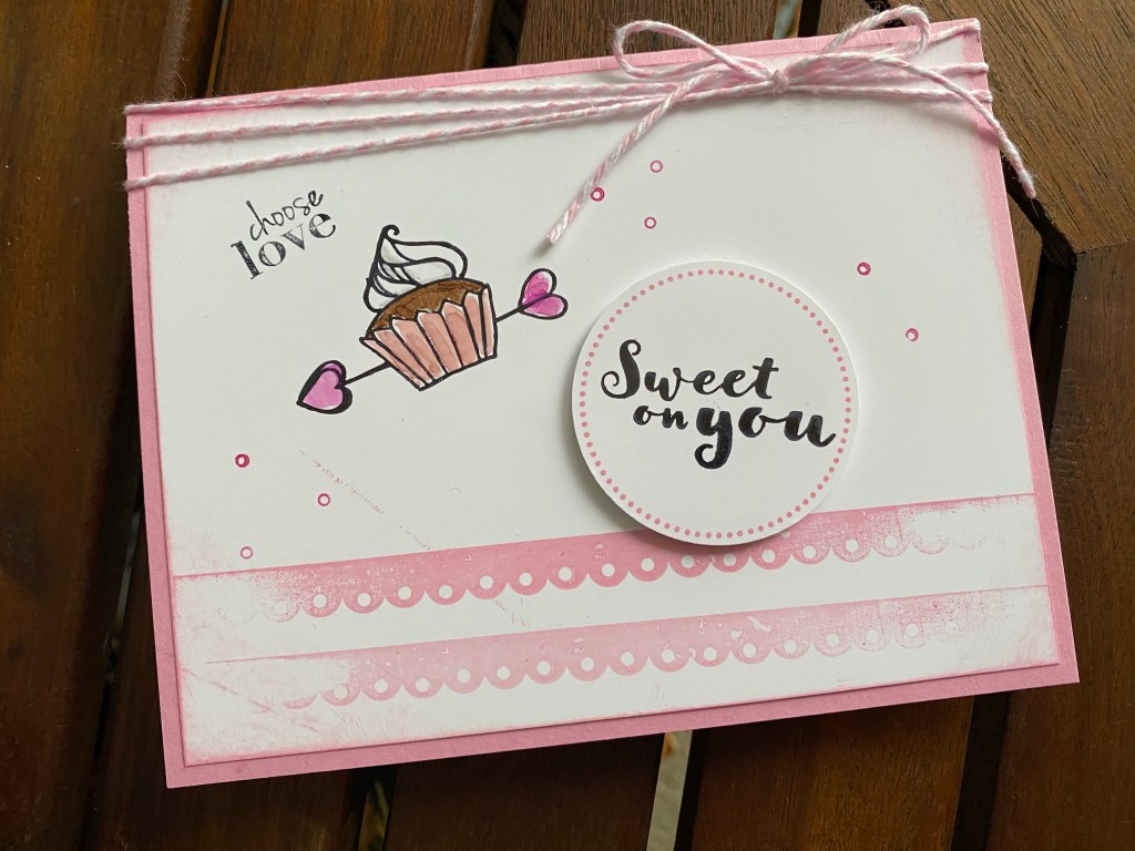 Stamps: HH21 Scallop Border, C300 Sweet on you, DD83 Choose Fun Cube, AA33 Open Dual Dots, FF48 2” Circle and Dots, EE45 Arrow Cupcake