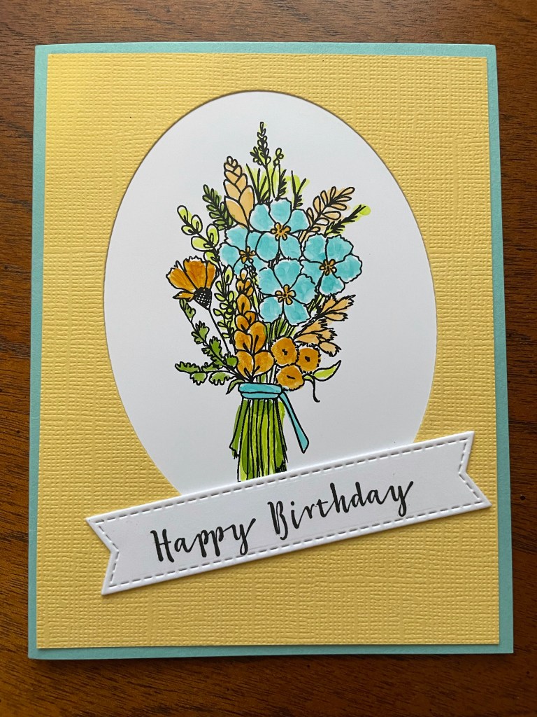 Good Evening! I know that it has been awhile since you heard from us! We ran into the great pestilence called Covid. WE are on the mend and doing well. I do love Birthday cards that are simple. As you know, I do things in bunches. I stamped 10-15 floral bouquets and then spent an afternoon coloring them. Such fun! Now they are finding their way into cards. Pictures do not truly show how lovely this card is. I hope you are all well and having fun Stamping.