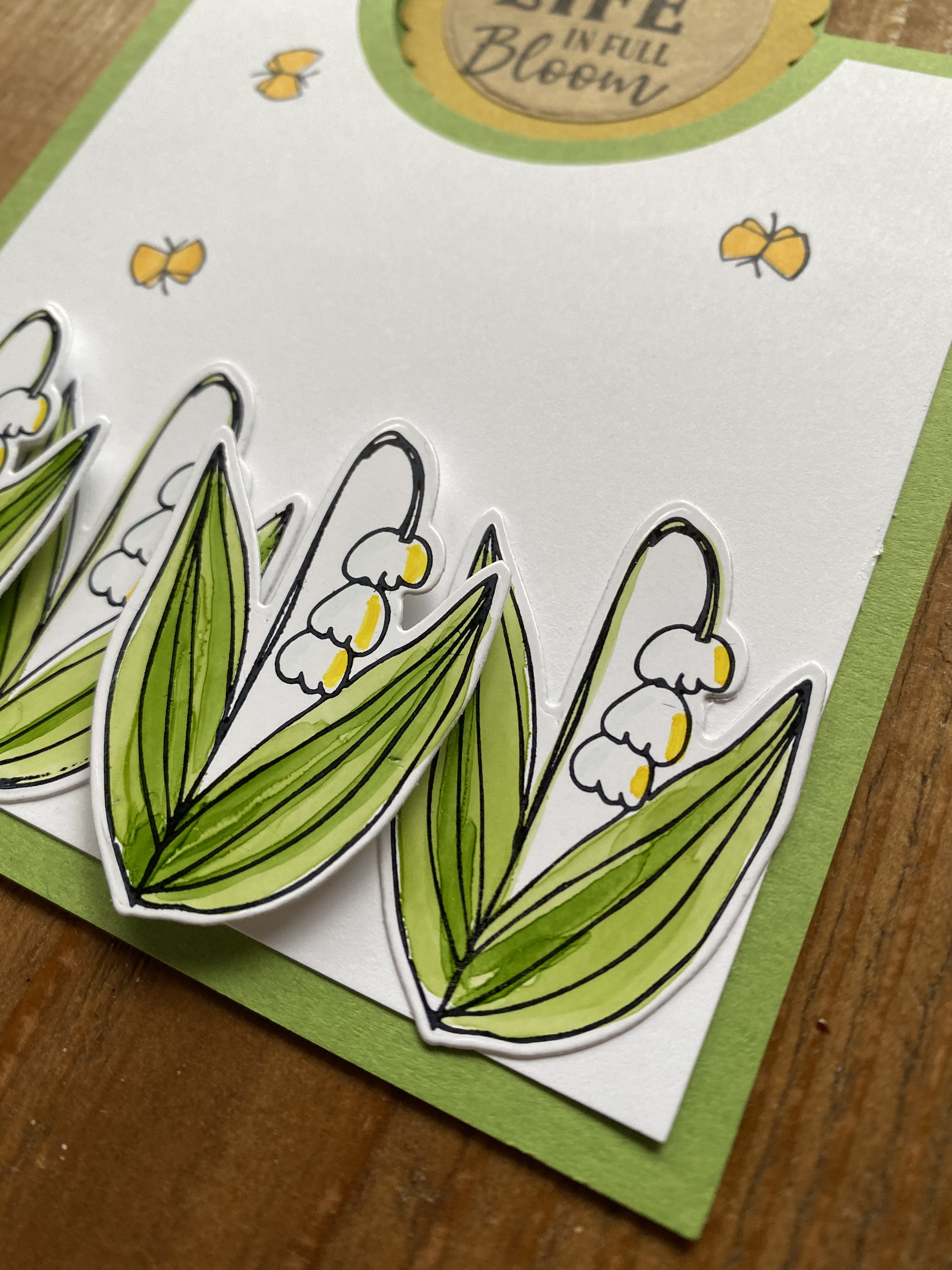 For this card, I used the small turkey and the cutting die on dull glossy paper after stamping the circle. Used a 1.75″ punch to cut out the circle. The white floral pattern is created with an embossing folder. We don’t have the folder for sale anymore. I think it is discontinued now but could maybe be found in a google search or any plaid/leaf/autumn pattern would be fun. The images were colored with alcohol ink markers. Links are below!