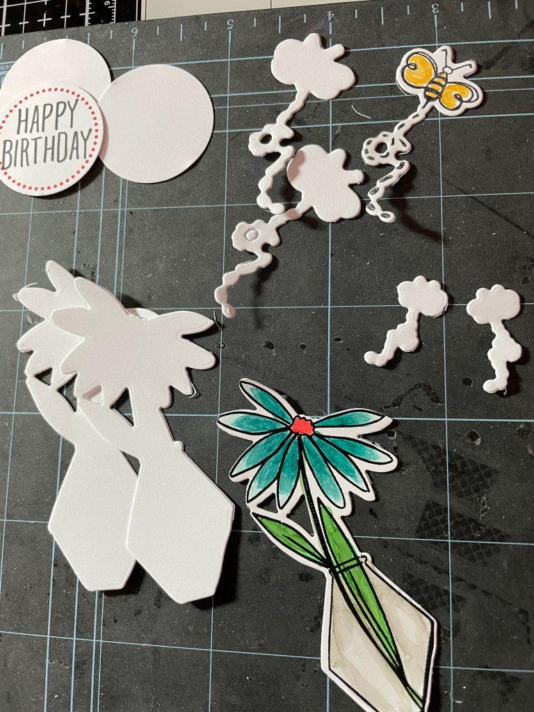 I cut out extra and glue together and layer. No need for 3-D-Dots! They add so much depth to the card but it’s hard to see on the pictures. if you’ve gotten a Frog card kit or the Present card kit-you will know what I’m talking about!