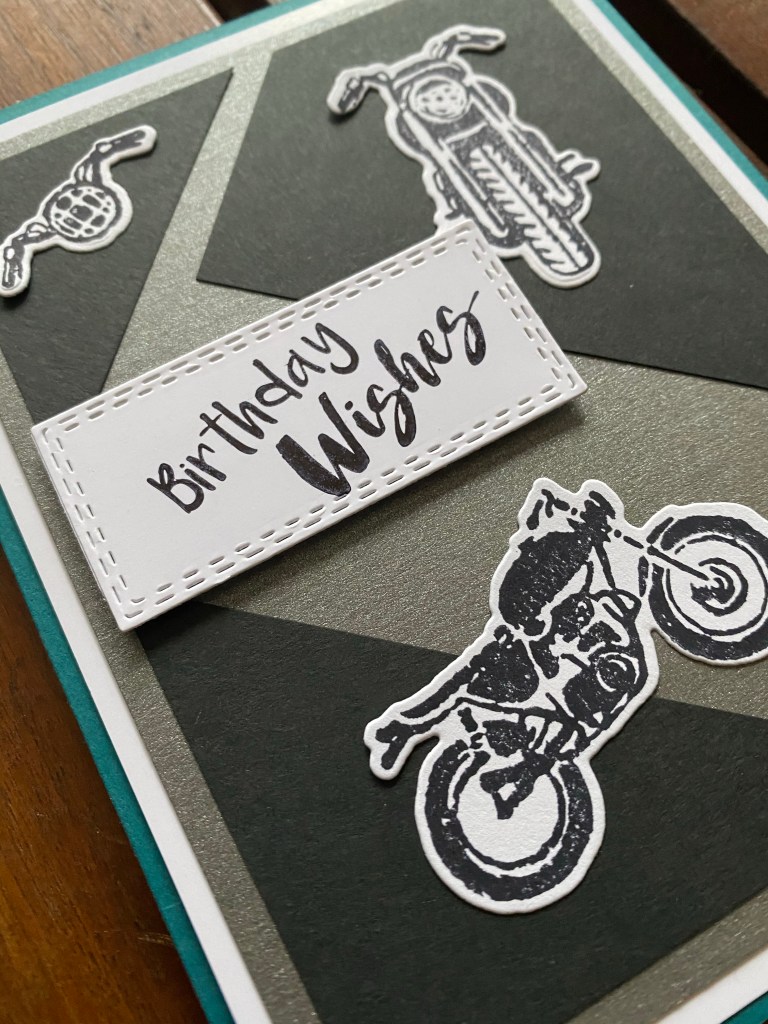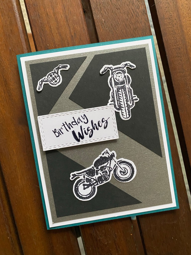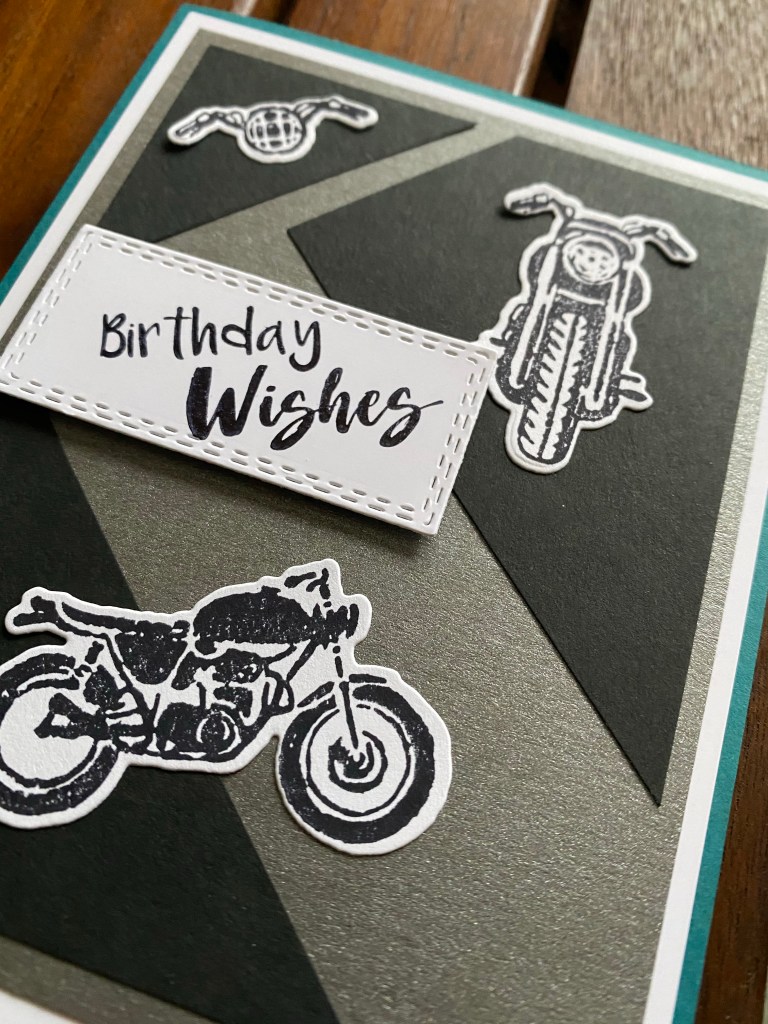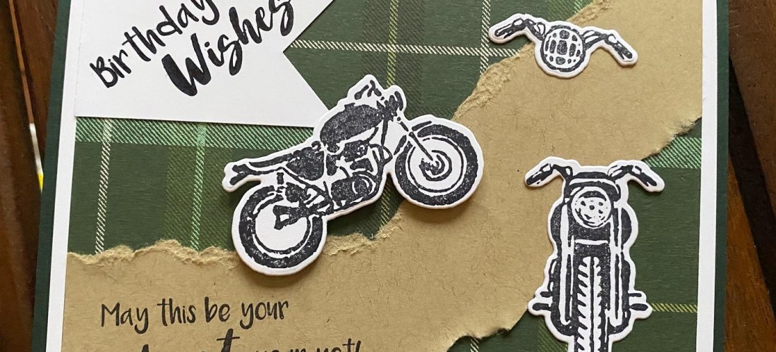 Stamp links: CMO107 Motorcycle Set, Motorcycle Cutting Dies, E315 Adventures Continue, C320 Handmade Card Inside, F312 Happy Happy Happy Birthday, F245 Wishing you