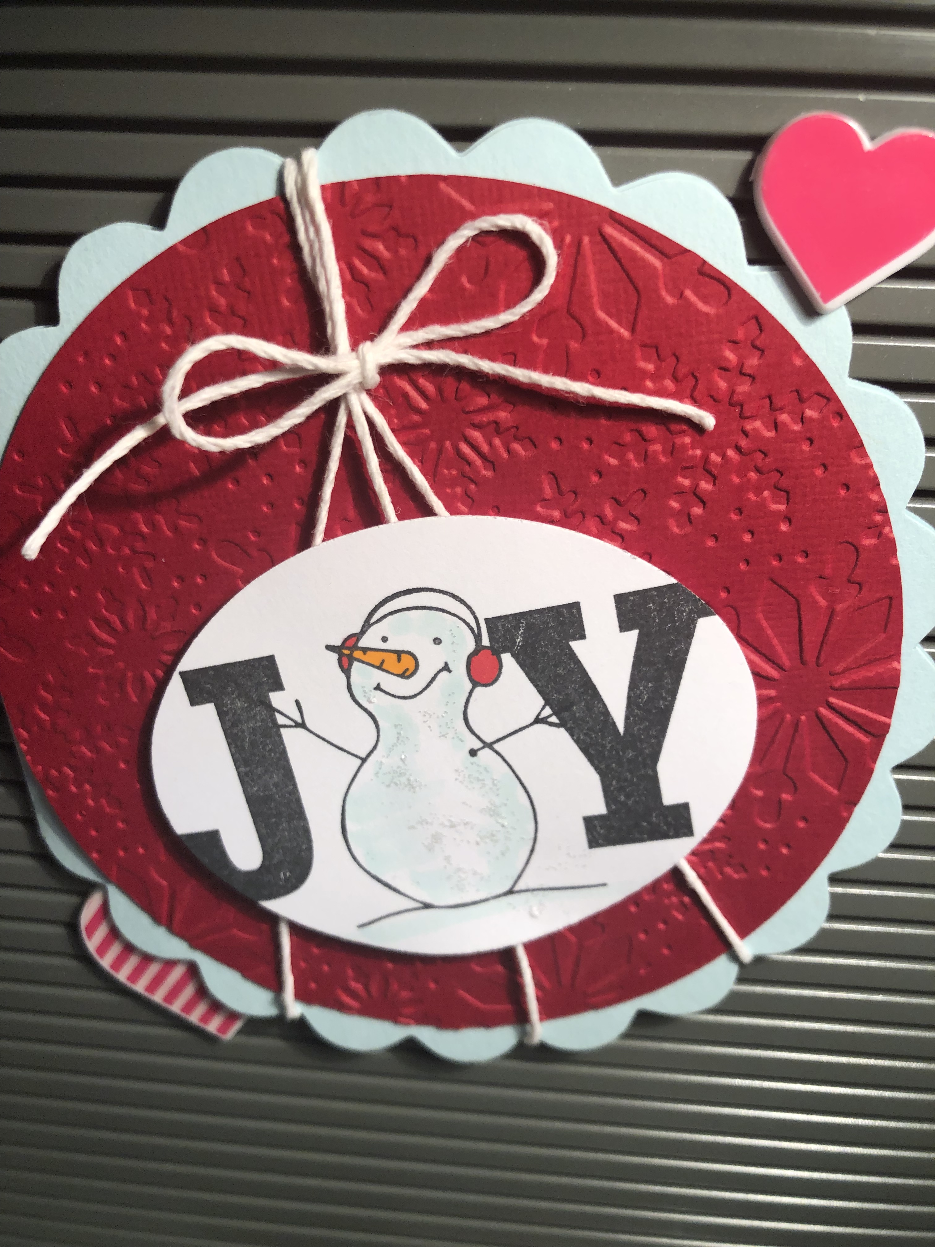 Good Morning! Hard to believe September is almost gone. Here we stamped the snowman with the earmuffs and held the image to a light with the cutting die on the back since it only comes in one direction. We use a post it note or tape to hold it in place. Have a good day!