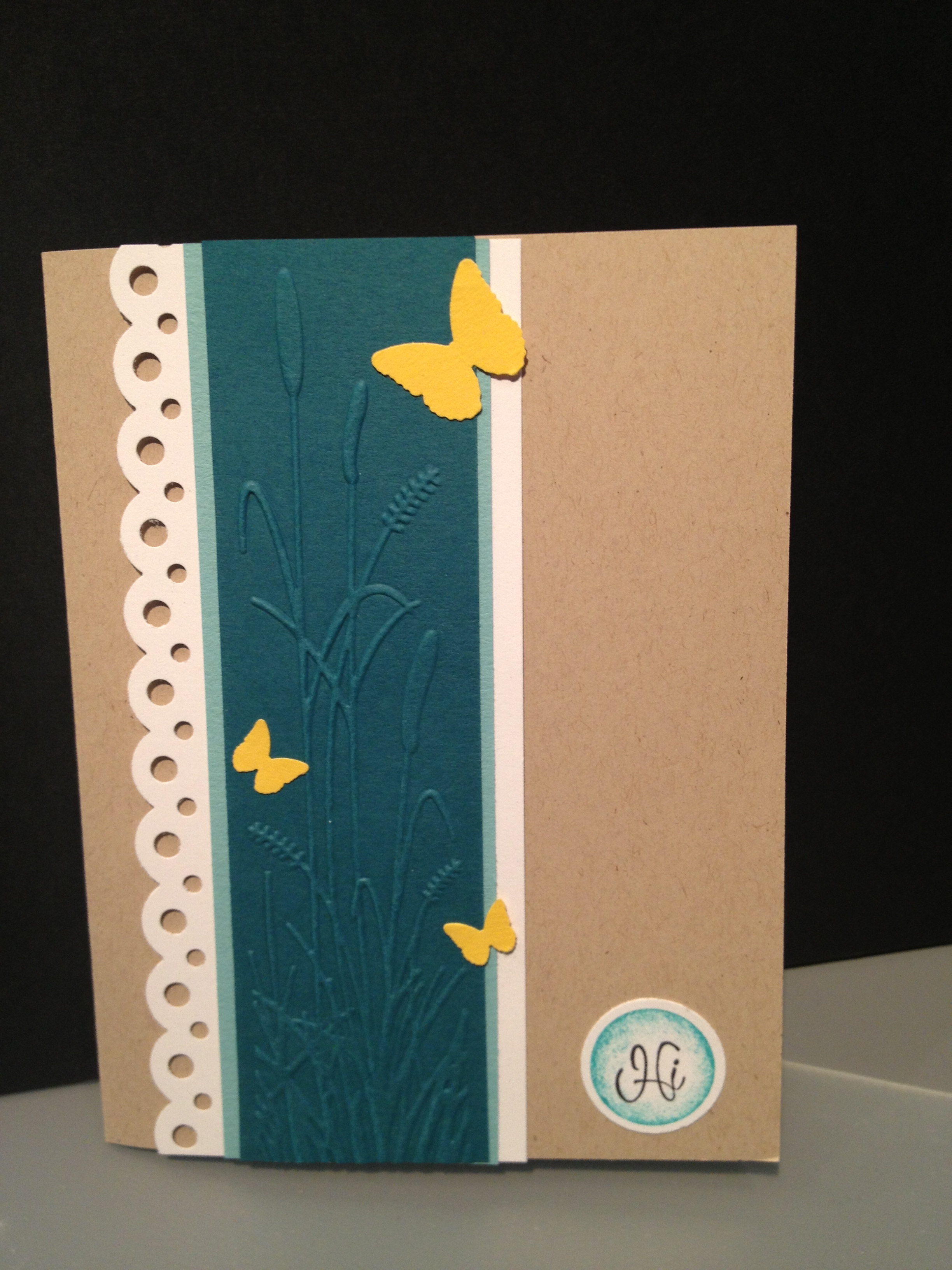 I’ve been liking these tall skinny embossing folders! They other thing I’ve been liking is the old solid block stamps. I stamped B68 which is a sm circle block around just the edges…punched it out…and then stamped the A205 Hi in it. Looks so much better than just punched!