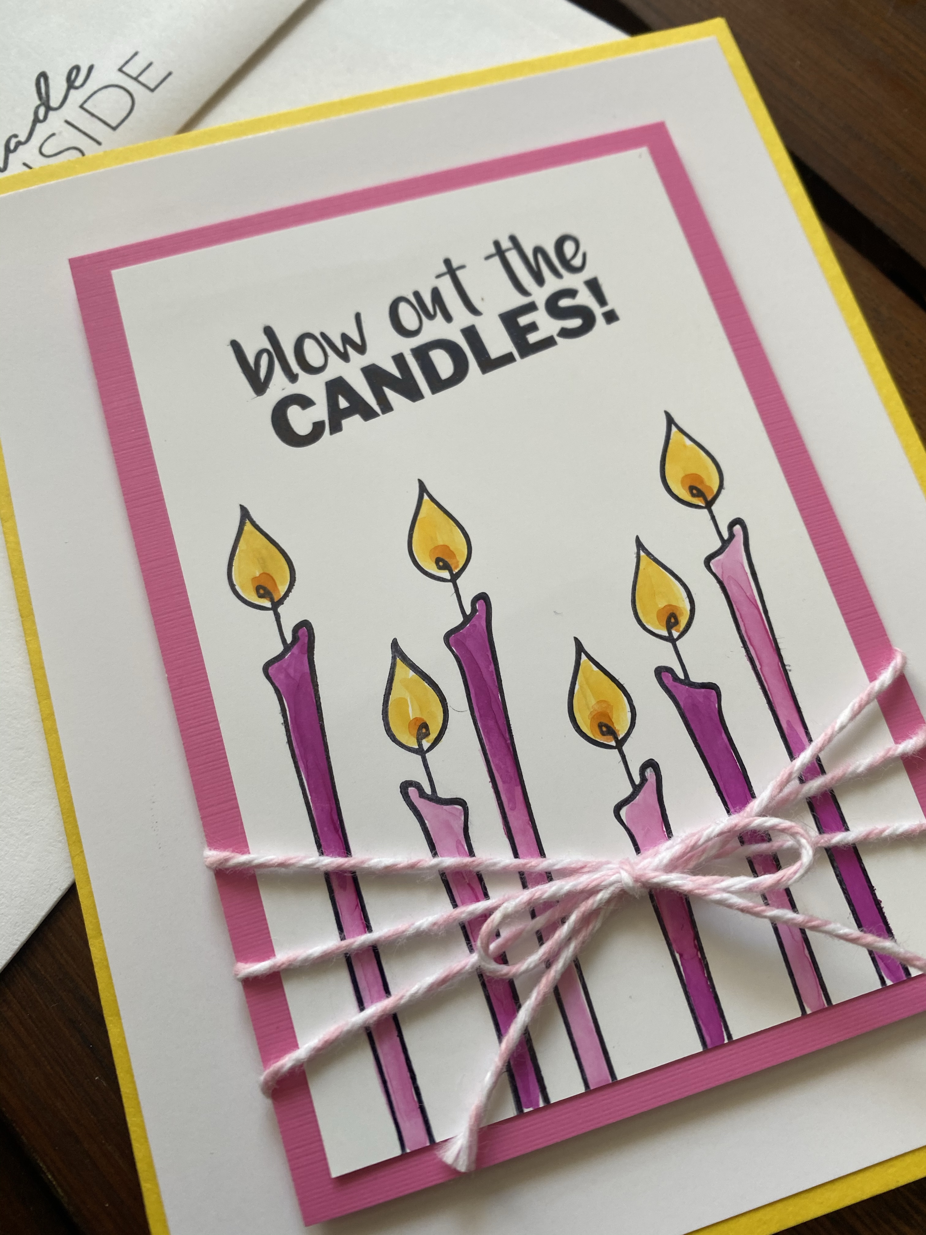 A little break from valentines with yesterday’s sympathy and today’s birthday card. I love these skinny candles and love blending the alcohol ink markers. I had one little issue with the dark blue that it just wasn’t blending well. I tried putting it on first and then the lighter color and then tried reverse. Not sure why it dried so fast but oh well! That sometimes happens. Things don’t always go as planned. Still love how these look though!