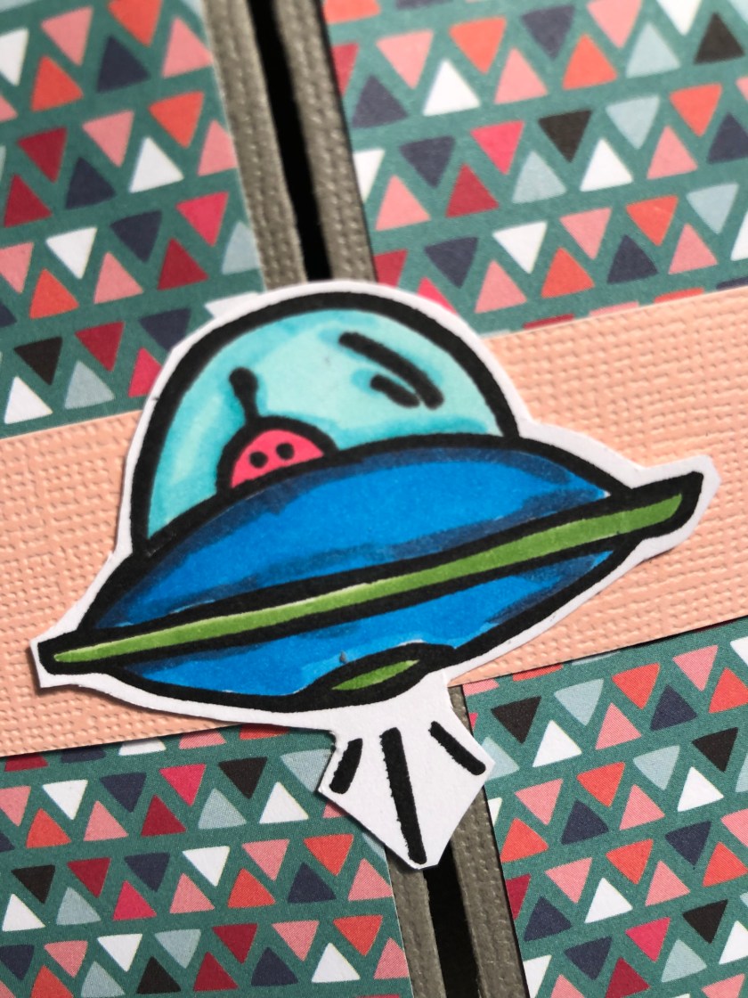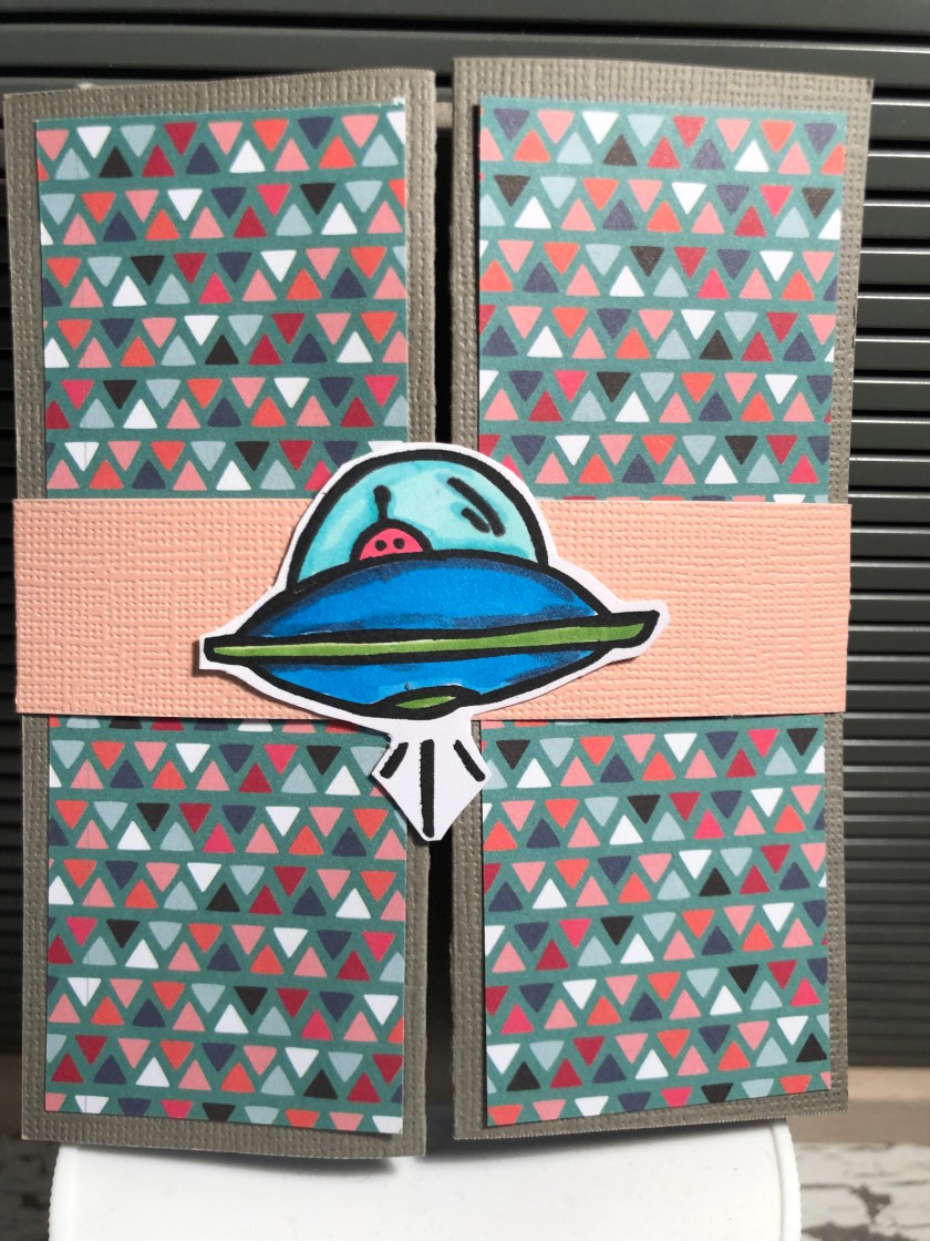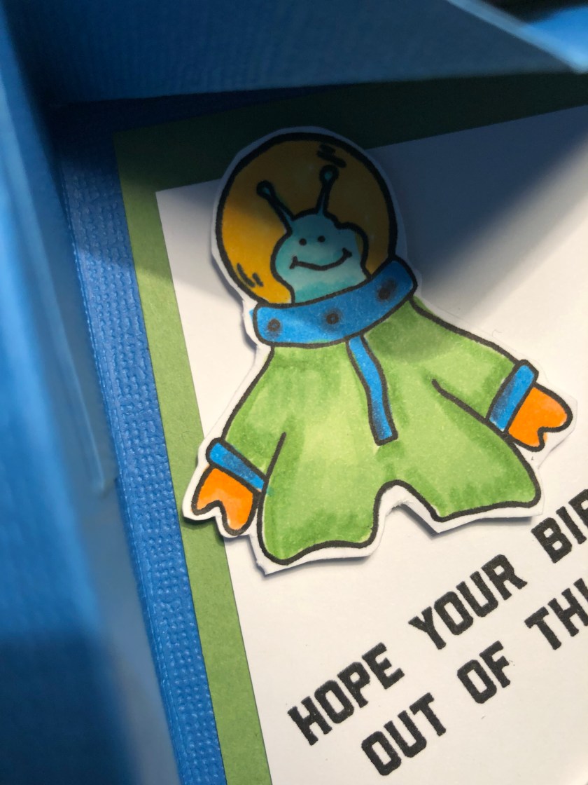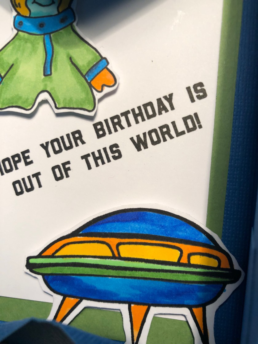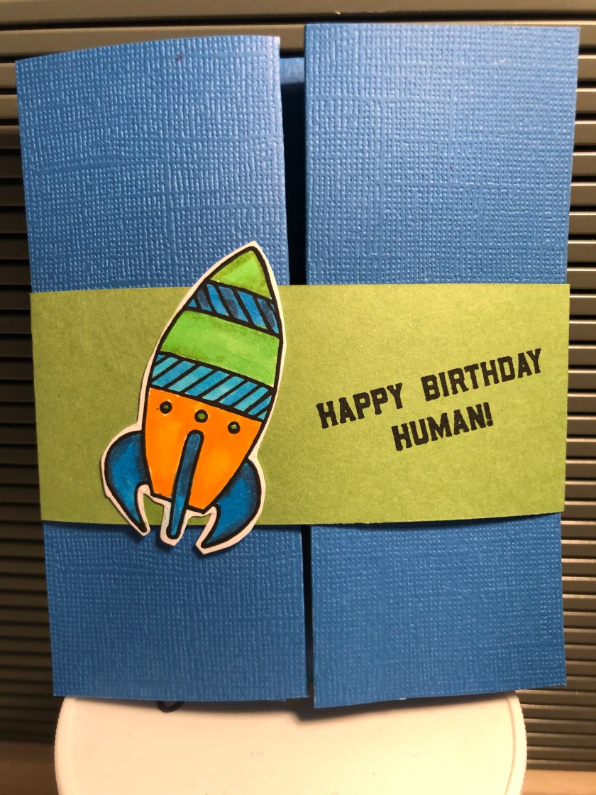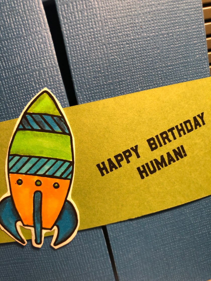 Stamps Used: F307 Standing Rocket Ship; F308 Rocket SpaceShip; F306 Space Alien; C325 Happy Birthday Human! E341 Out of This World BDay;
