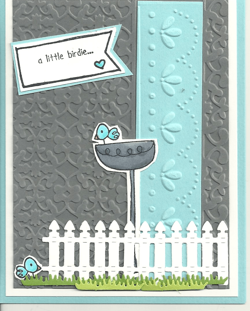 I did use the same Kimberly’s Card Embossing folder and another CottageCutz die! Love this little picket fence and it comes with grass. Enjoy! Beth