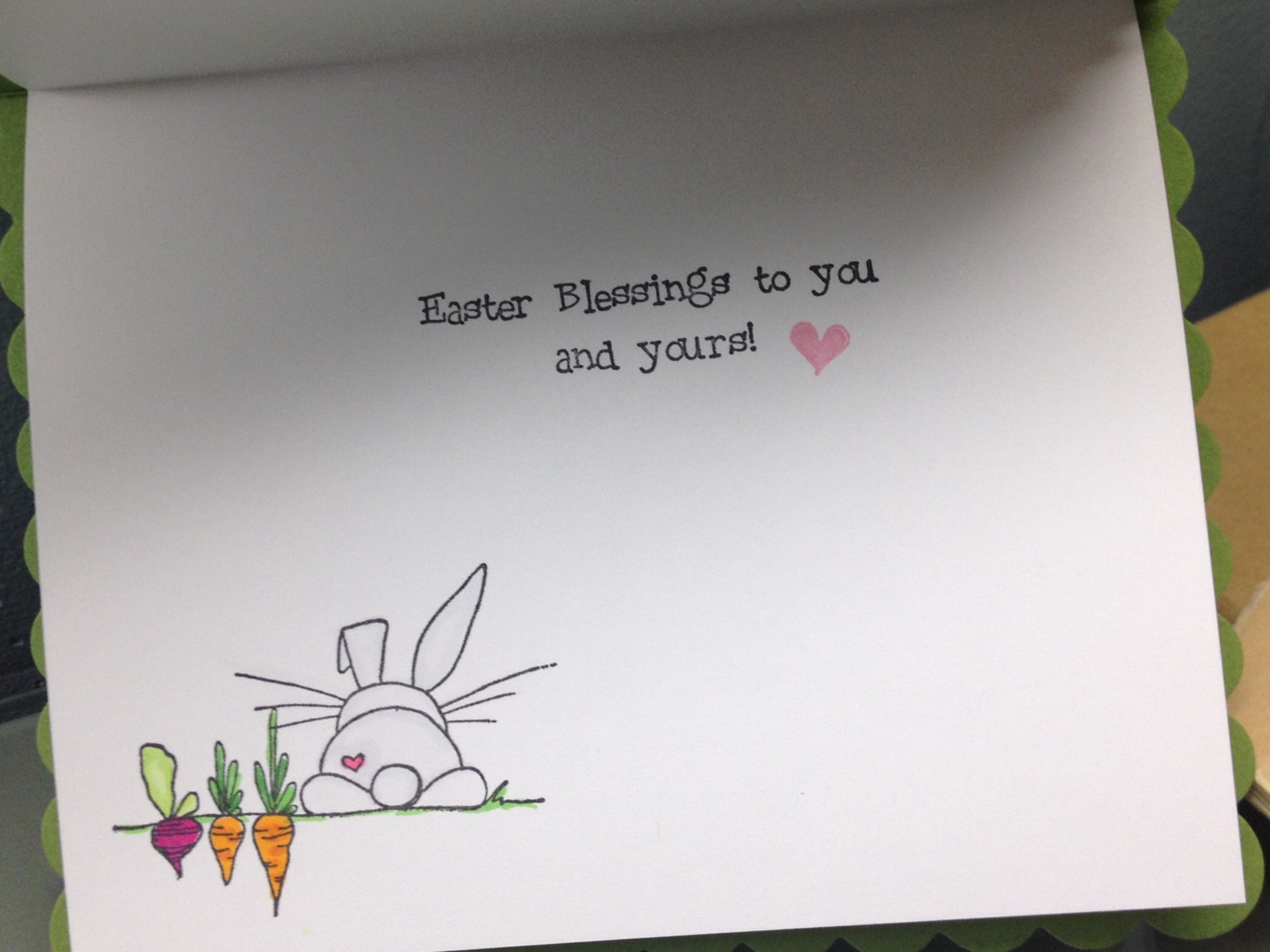 Stamps Used: Â JJ17 Skinny Chevron Border, HH31 Chevron Border, EE44 KB’s Bunny w/ radish, A190 Single Heart, C129 Easter Blessing to you and yours, DD63 Dots & Line Circle, DD36 Easter Fun Cube.