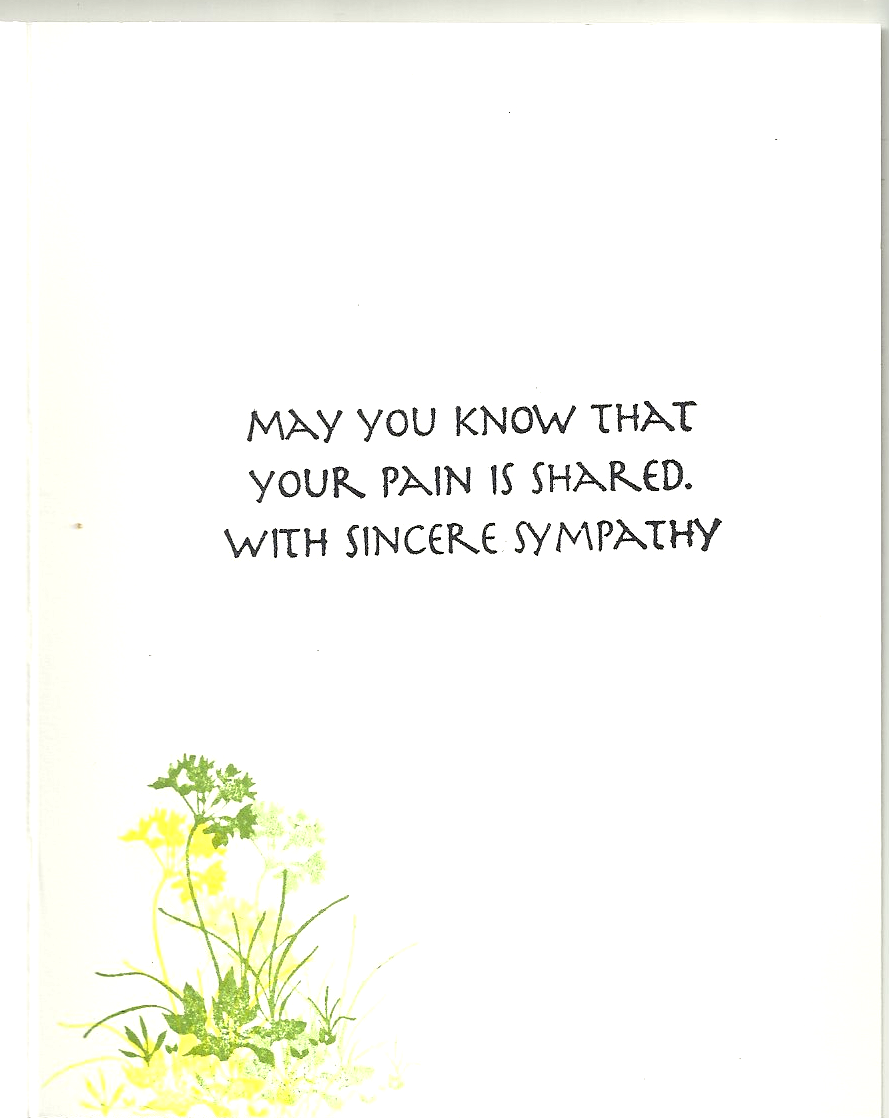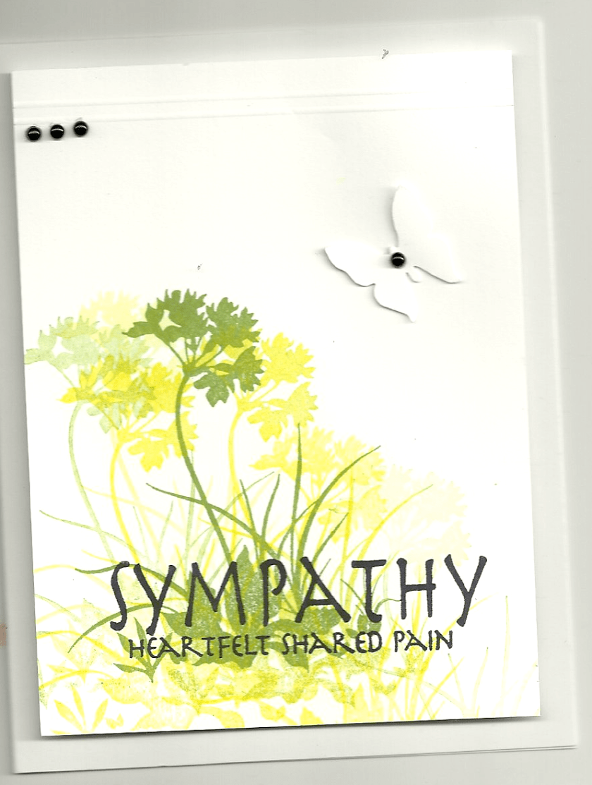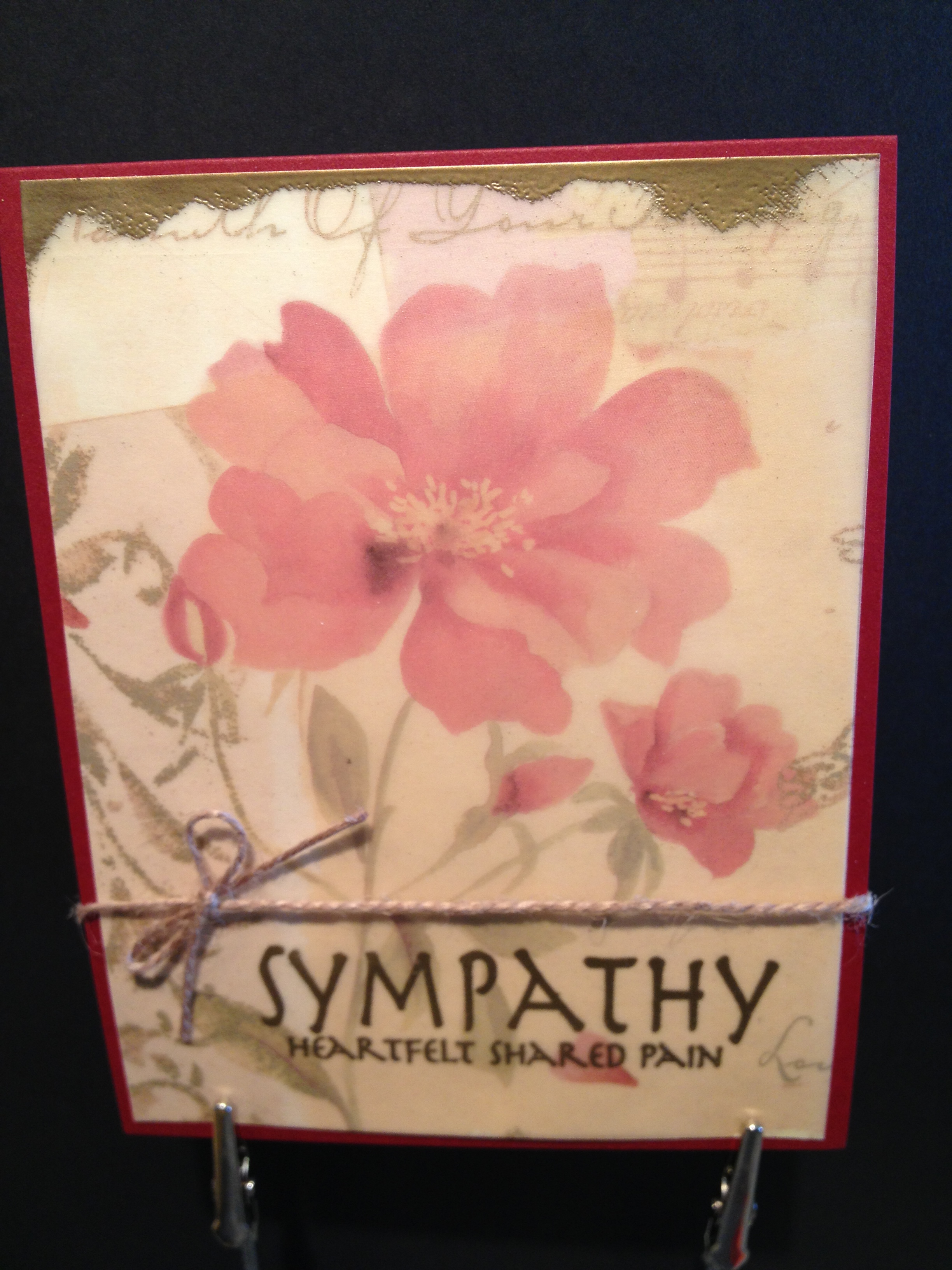 So just a couple more vellum cards and then we’ll be on to something else! Vellum cards make nice easy uncomplicated sympathy cards. Stamps Used: E110 Know Pain Shared; F109 Heartfelt Sympathy. One interesting thing…I never shop WalMart. Almost never is really the case but sometimes when we are on the road it’s a quick easy stop since they are everywhere… At home I’ll pay more for something just to avoid WalMart. But I happened to go there somewhere along our travels (we probably needed snacks for the drive!) and I came upon this jute that you see on the front of the card. It was only $4 and came in two different packages. It works awesome. It’s pliable enough that it’s easy to work with and the bows stay when they are tied. Love it. Haven’t looked at my local WalMart yet since I never go there but for those of you who do…it’s a great product.