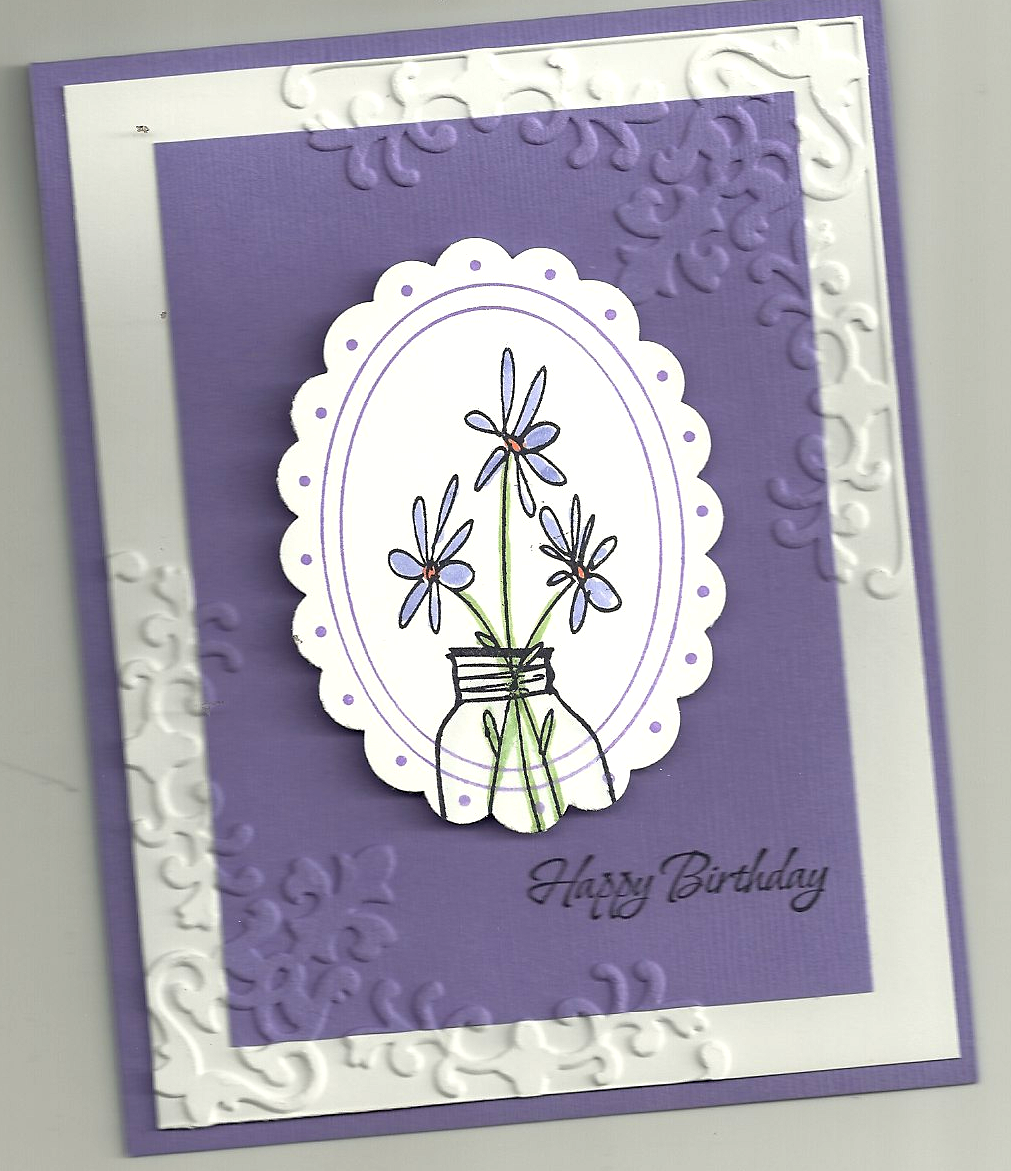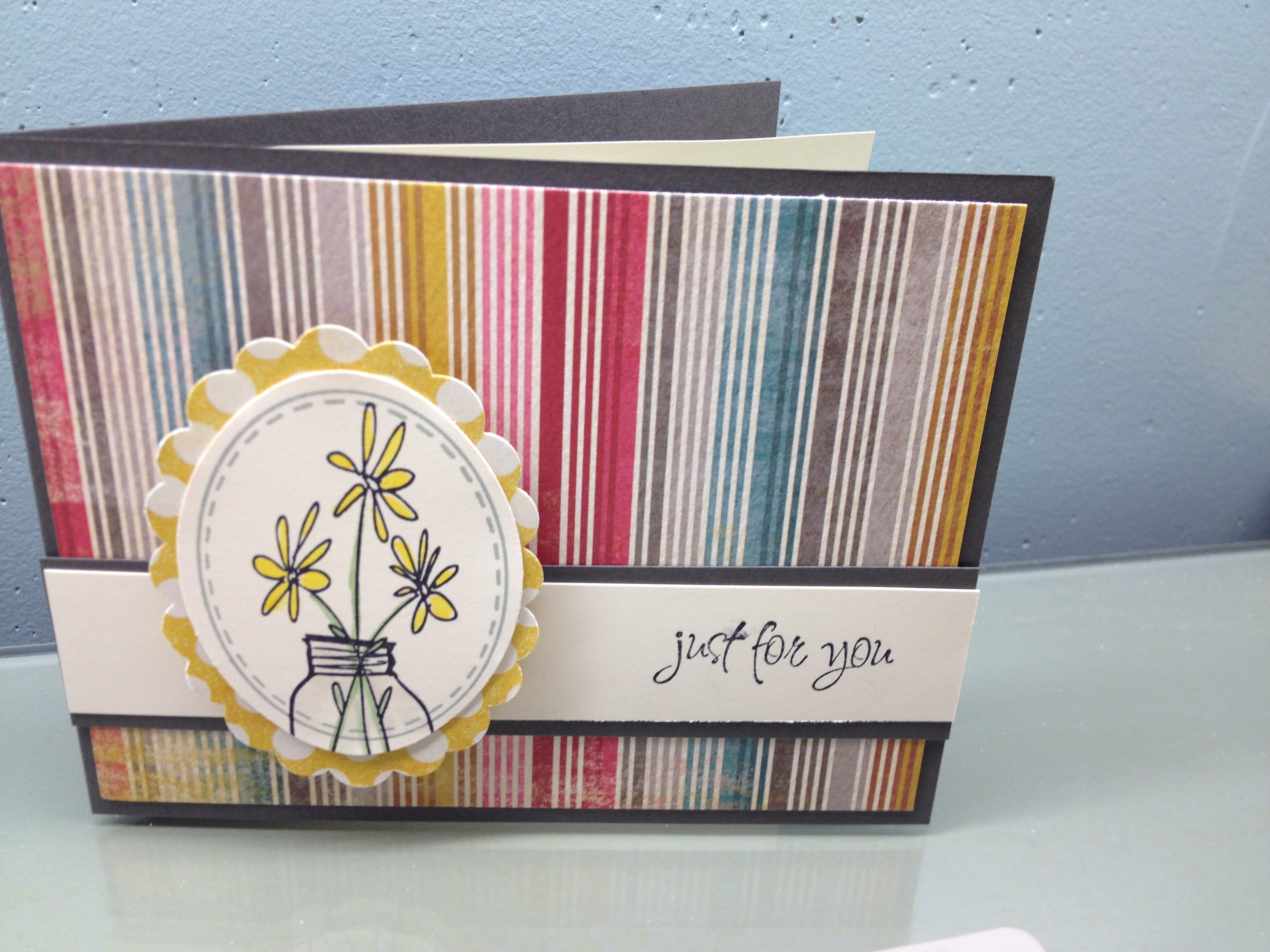 I love this printed paper! Stripes! Polka Dots! You can never go wrong with stripes and polka dots. Just a simple clean card! Stamps Used: G165 KB’s Silphnium in a Jar Lg, GG19 Giga/Mega Stitch Stamp, C238 Just for You. This card is so ME!