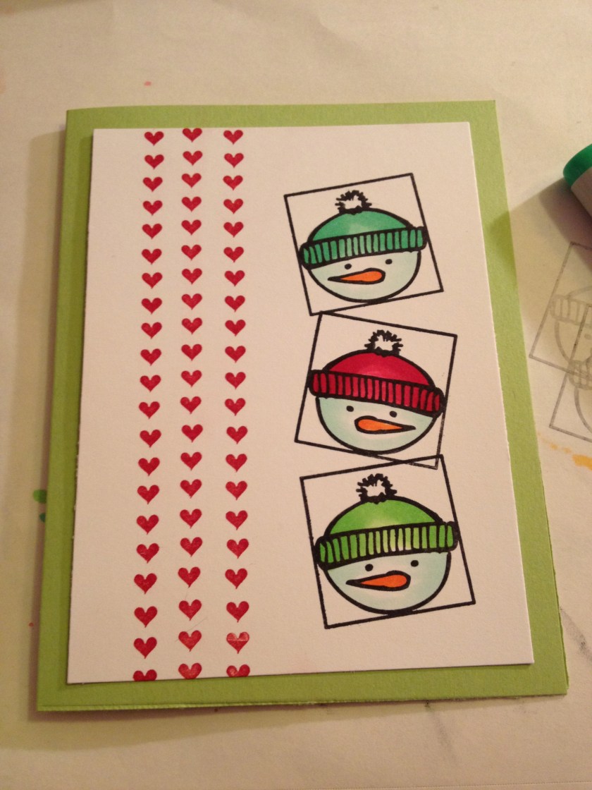 Stamps Used: HH26 Hearts Border, G327 Brr! Baby, it’s cold outside!, DD59 Sending Fund Cube, DD63 1″ Dots & Circles, EE42 KB’s Heart Snowman Looking Up, EE41 Dots & Lines
