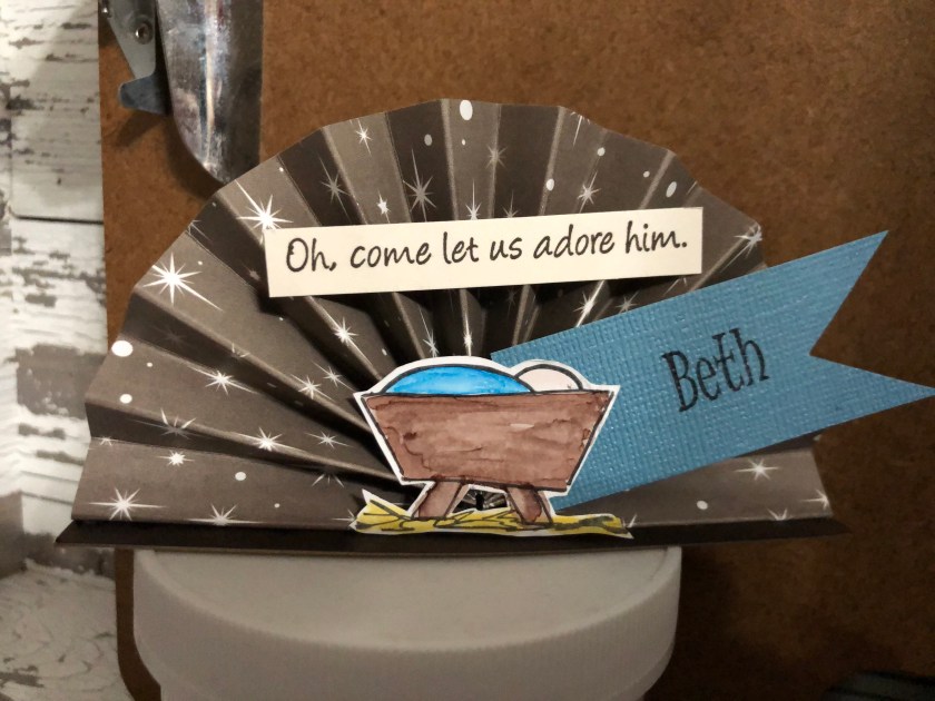 Made a cute Place Card today! it was a lot of fun, I cut the Bethlehem paper at 2.5″x12″ scored at each .50″ Glued it to a 1.0″x5.5″ paper. I did cut it a little in the end after glueing the fan down.