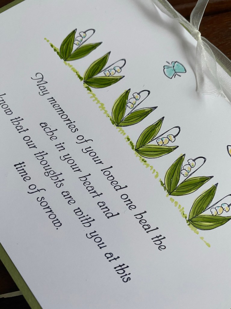 Sympathy card today using the small lily of the valley. The grass was created with a marker and the white paper is dull gloss.